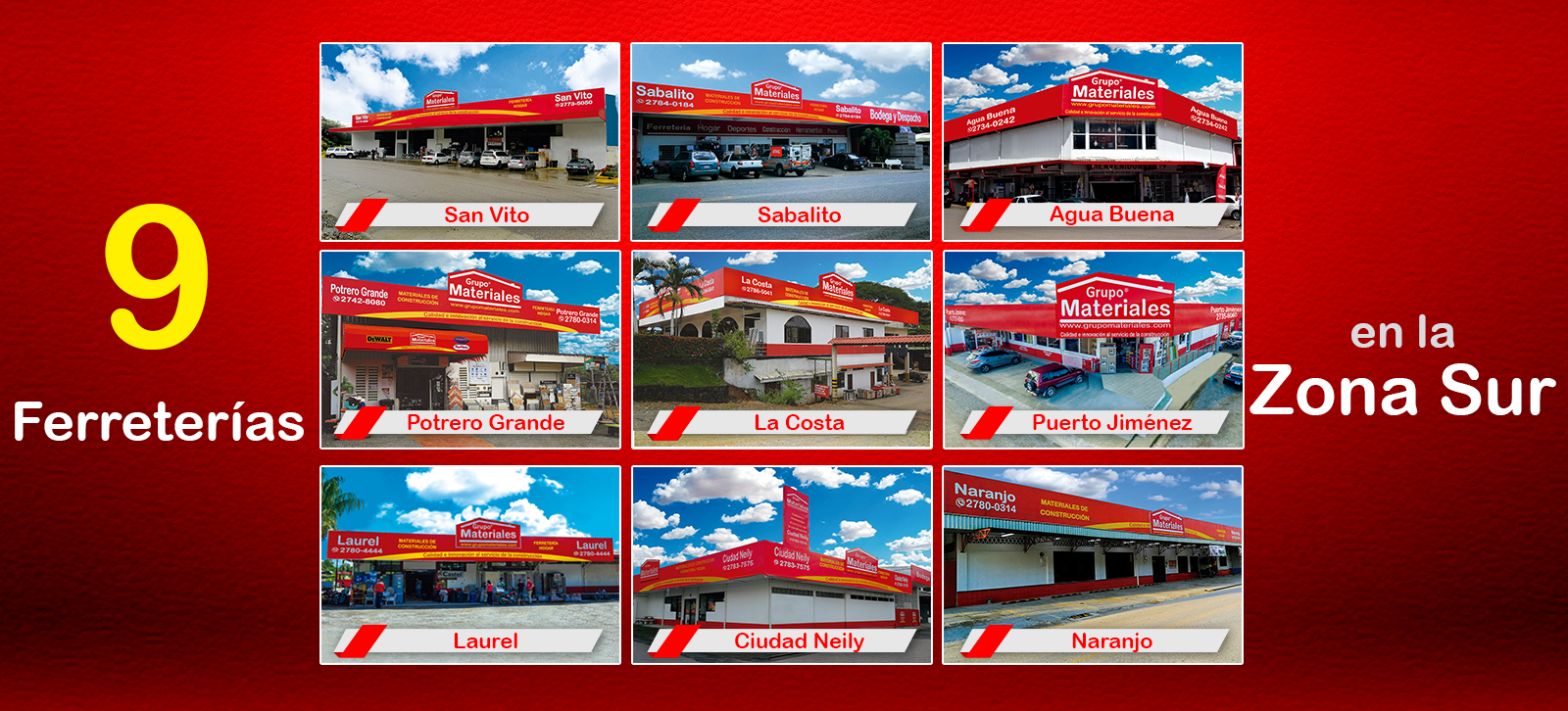 Grupo Materiales es una empresa costarricense que nació en 1998 con una ferretería en San Vito de Coto Brus. Actualmente contamos con 9 puntos de venta localizados en San Vito, Sabalito, Agua Buena, Potrero Grande, Puerto Jiménez, La Costa, Laurel, Ciudad Neily y Naranjo de Laurel. Gracias a la ubicación estratégica de nuestras ferreterías podemos ofrecer servicios a lo largo de toda la Zona Sur y el resto de nuestro país.